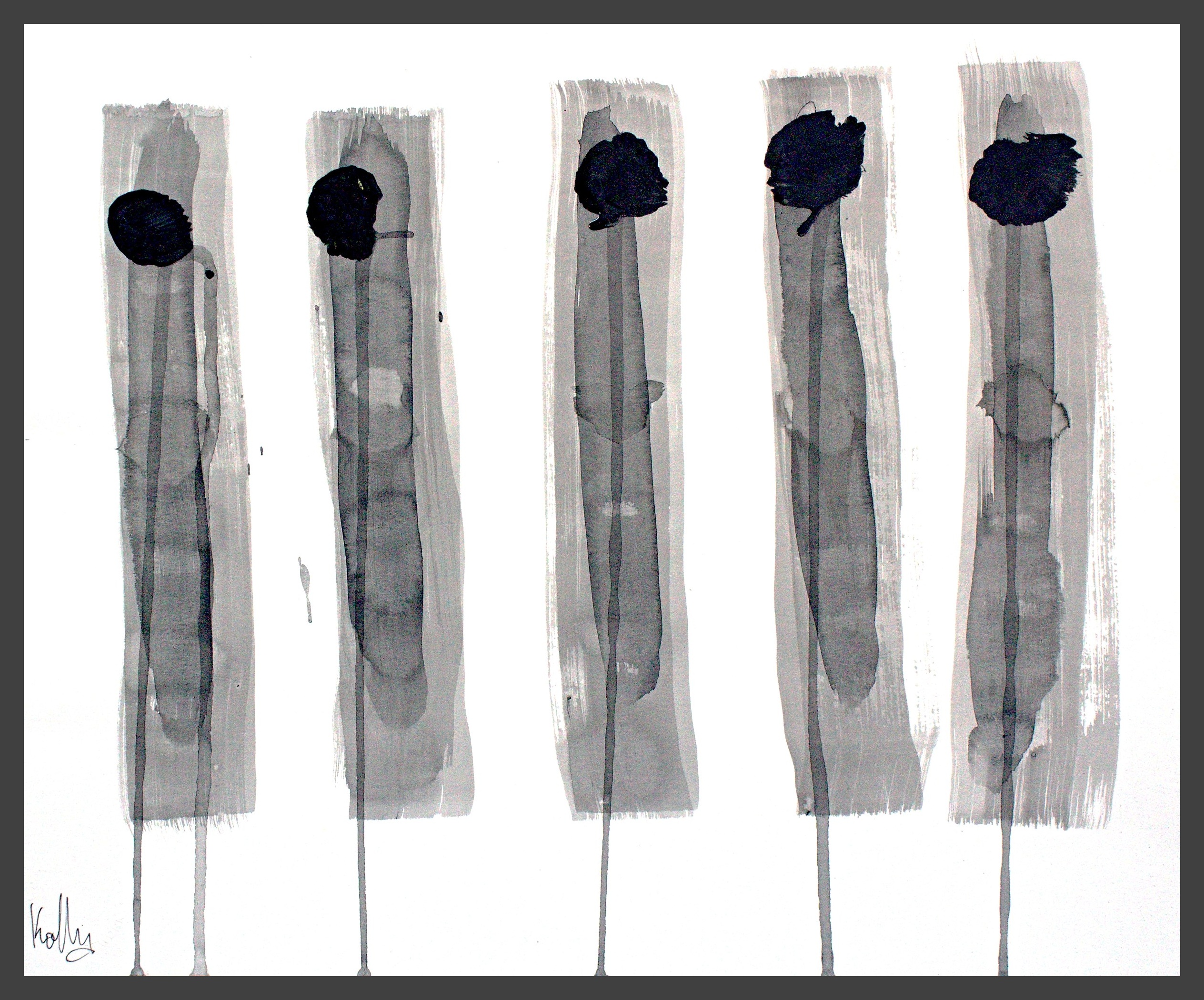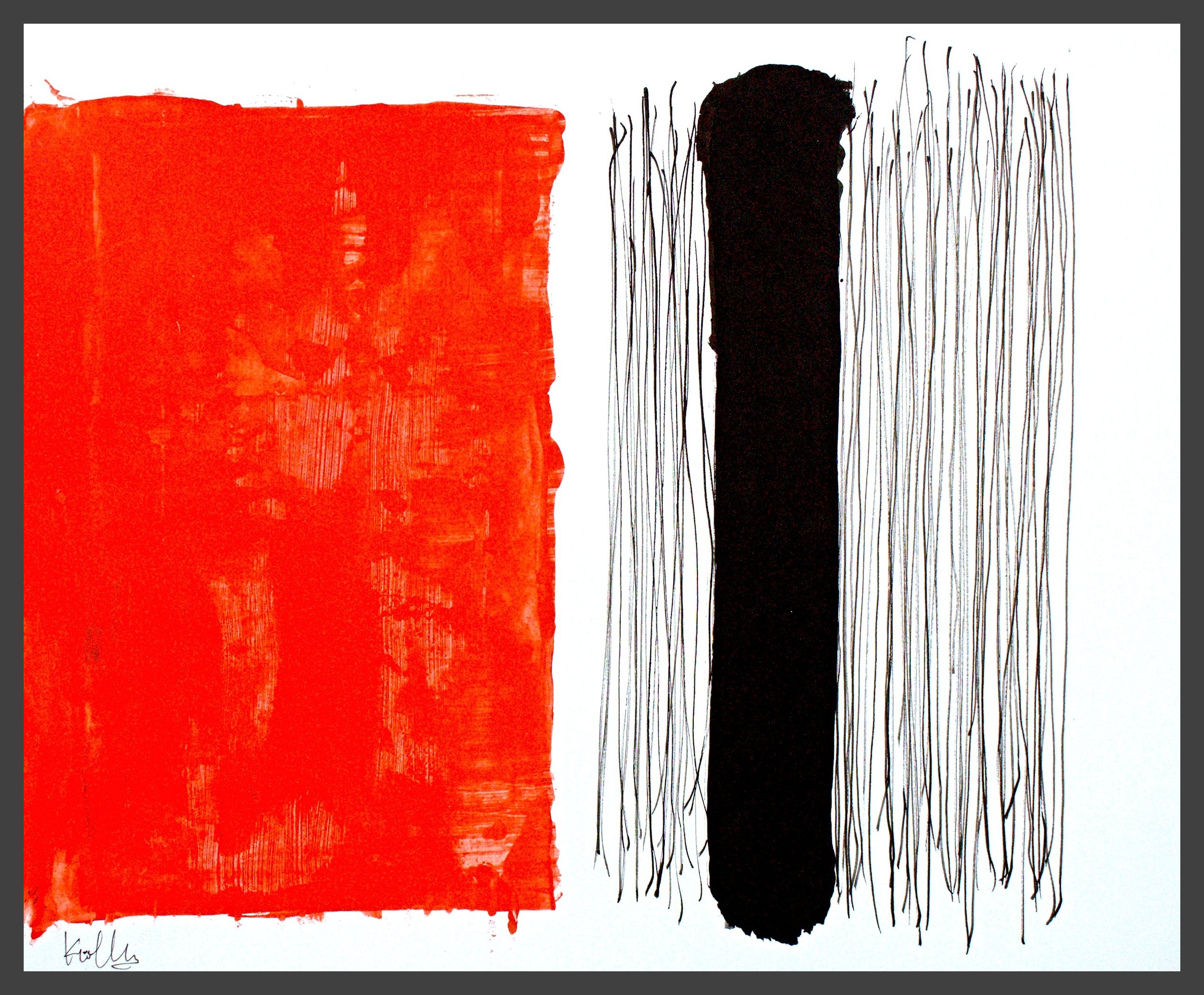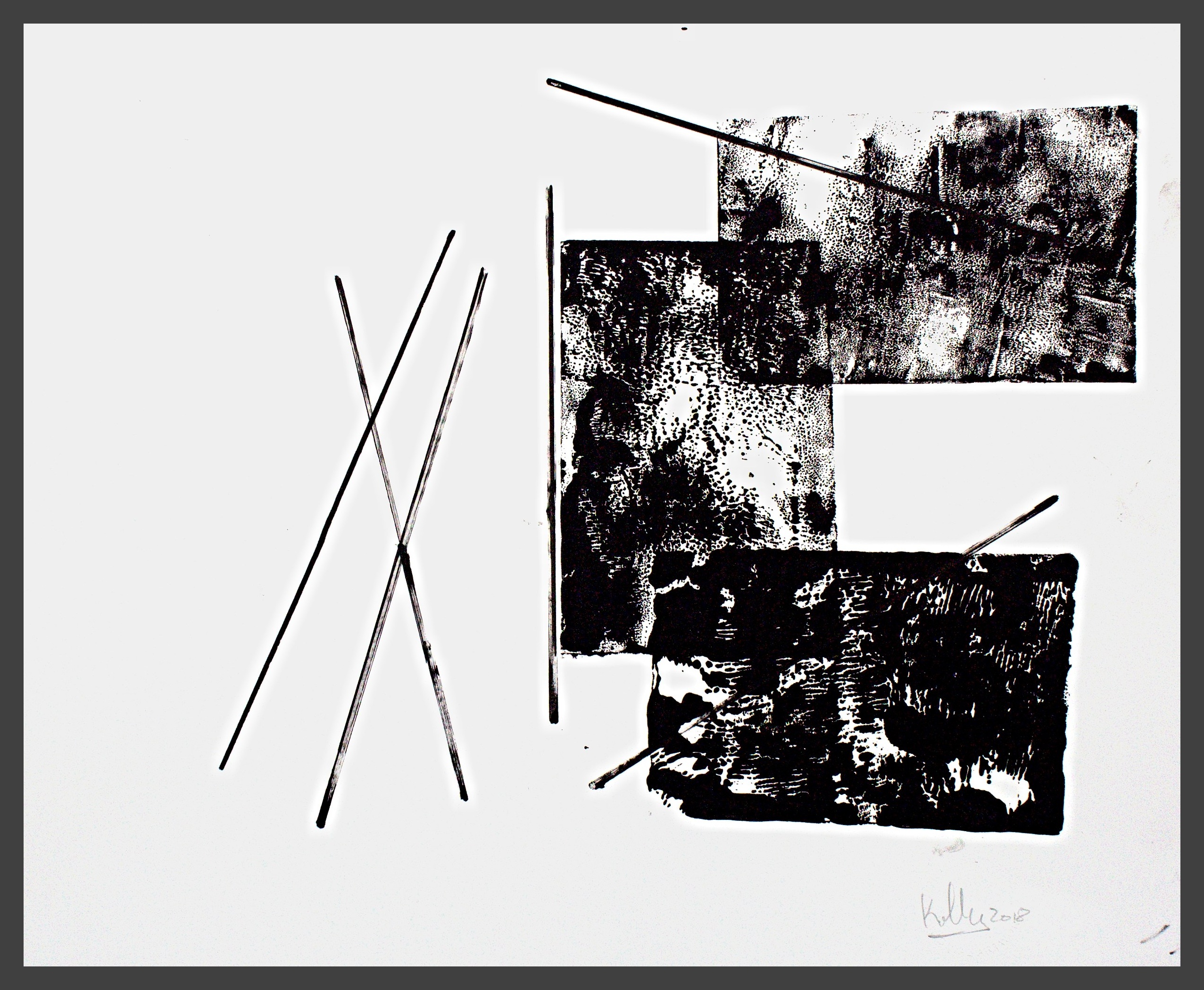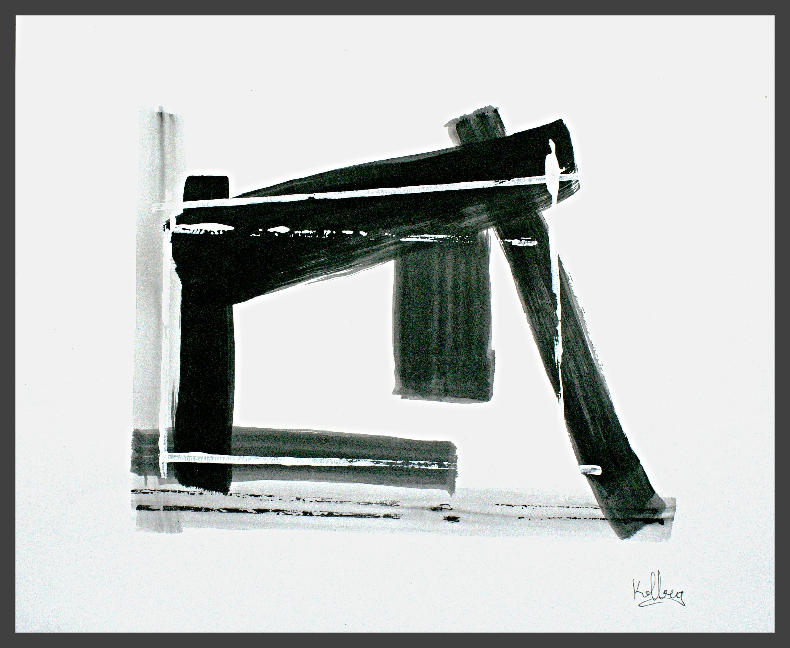 I use different densities of black color derived from hand ground Chinese Ink, carbon, mars and ivory acrylic black and thickened onyx house paint. The resulting matte surfaces and reflections of light mix with the intimacy of the paper to create an endless depth. I mix this with a variety of textures and geometric forms to establish an organic motion. Occasionally I use acrylic reds, blues and golds or gold leaf in the process. The mark making is created using a Brush, Squeegee and Scraper.