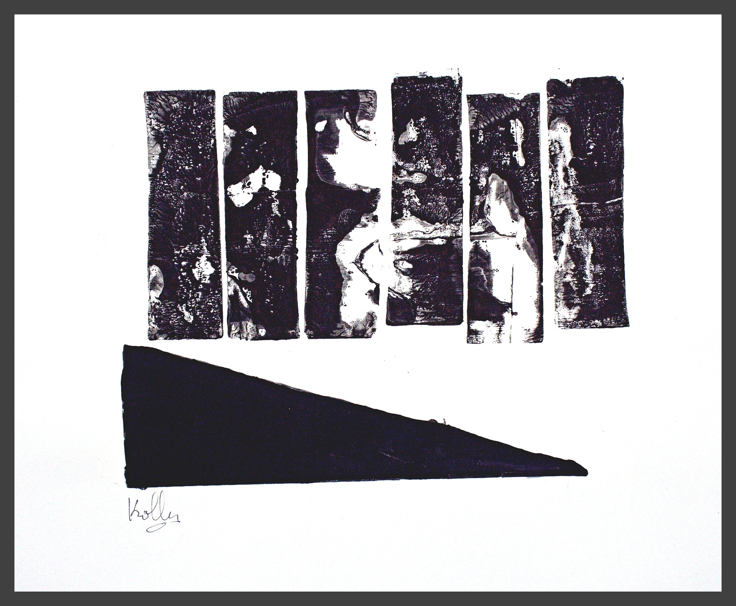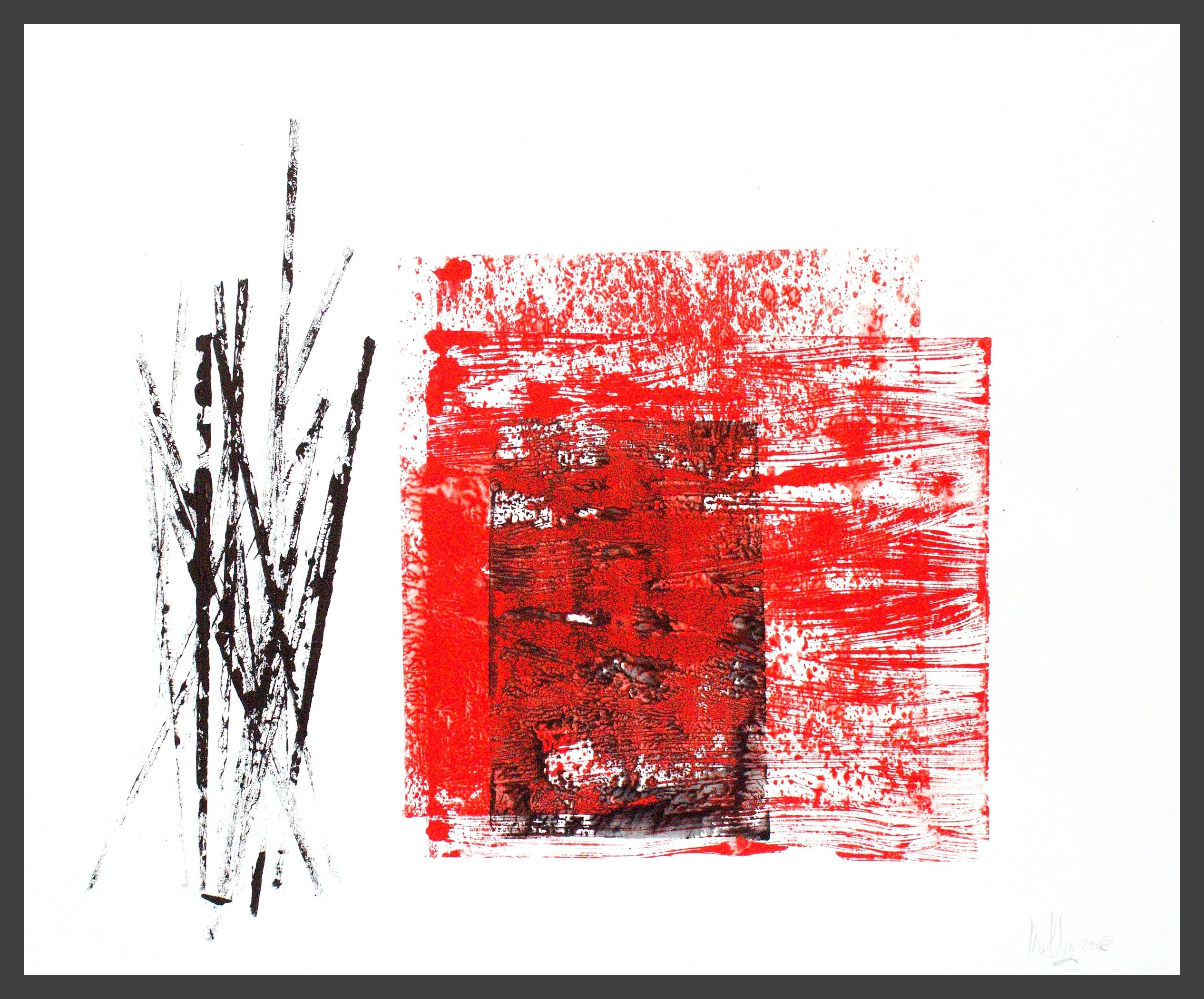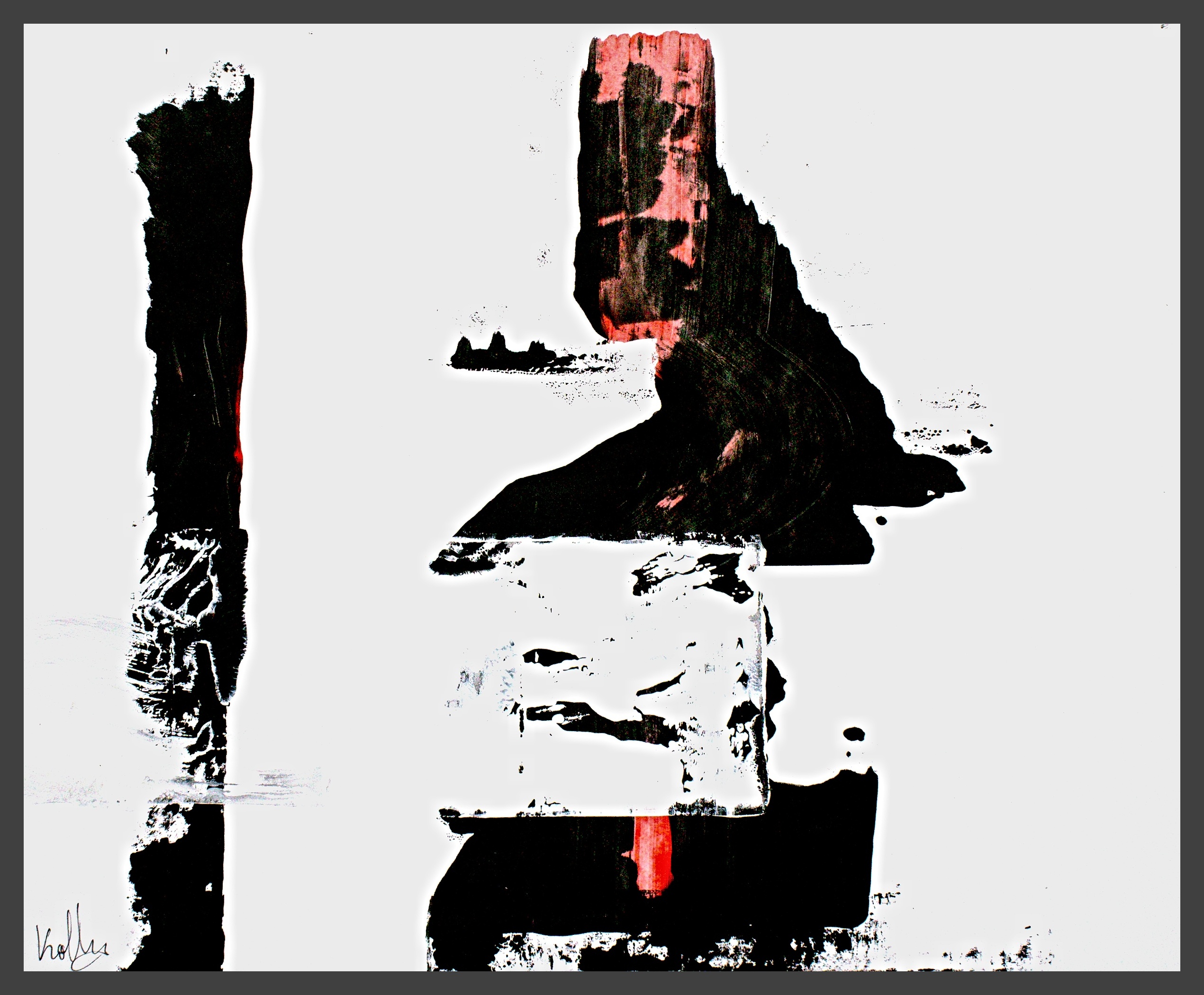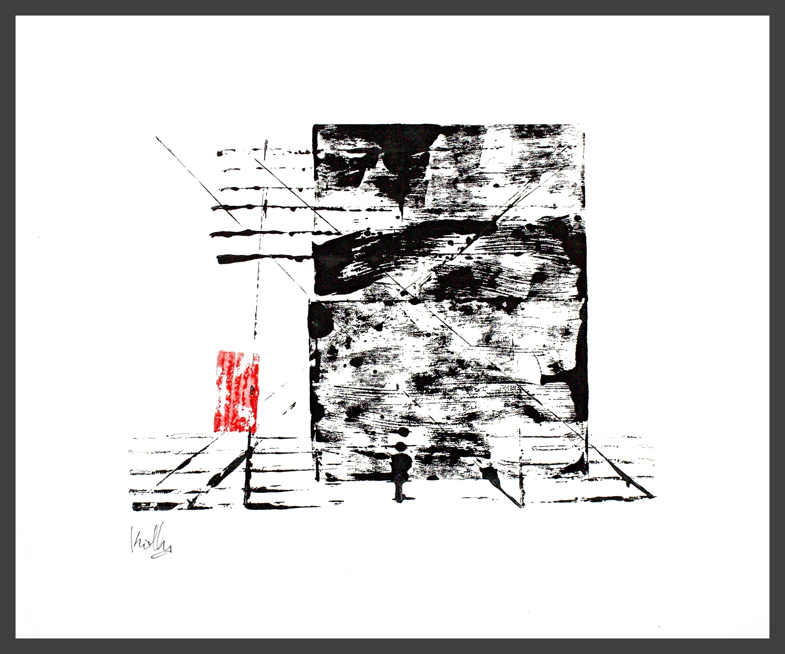 I use different densities of black color derived from hand ground Chinese Ink, carbon, mars and ivory acrylic black and thickened onyx house paint. The resulting matte surfaces and reflections of light mix with the intimacy of the paper to create an endless depth. I mix this with a variety of textures and geometric forms to establish an organic motion. Occasionally I use acrylic reds, blues and golds or gold leaf in the process. The mark making is created using a Brush, Squeegee and Scraper.