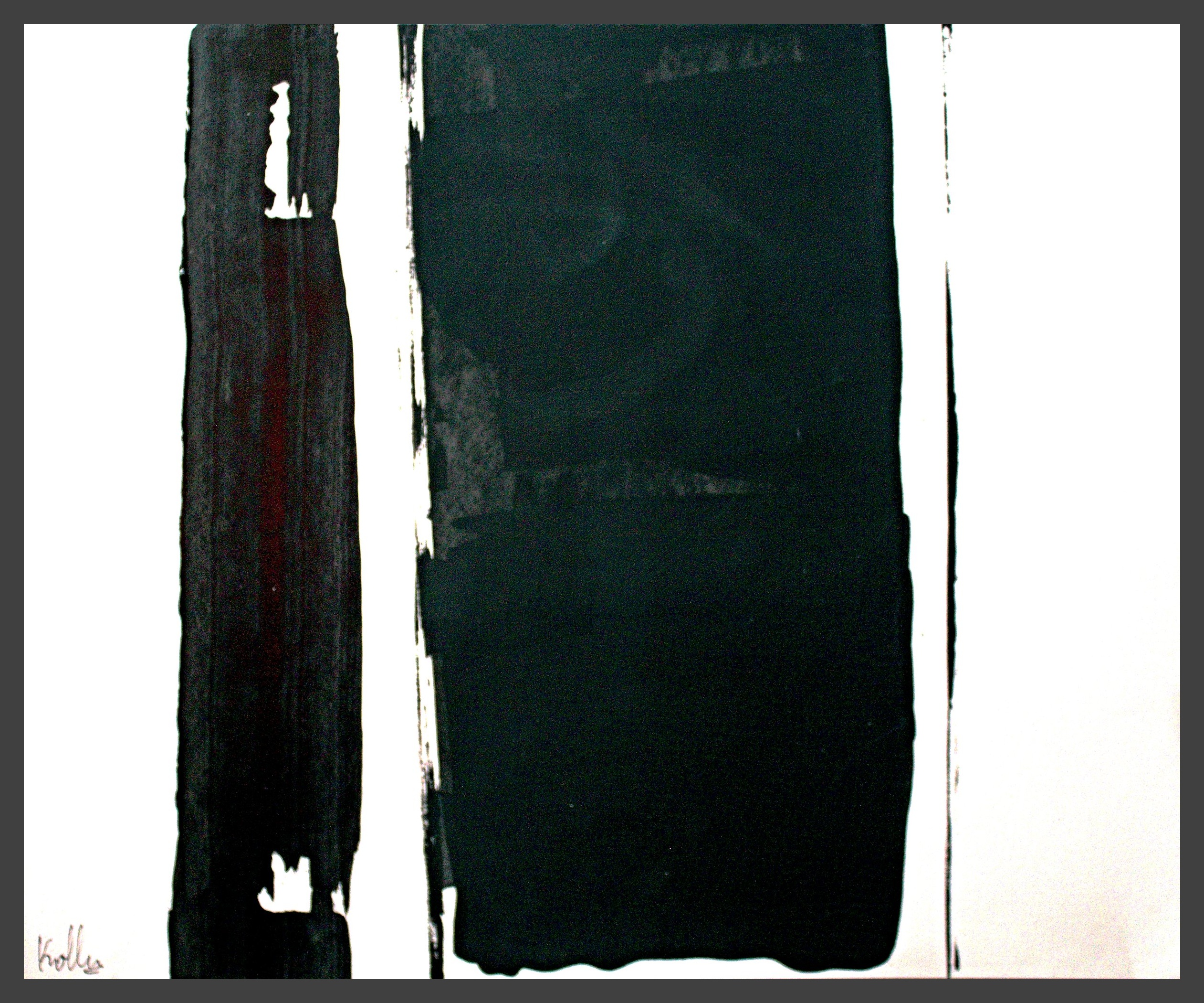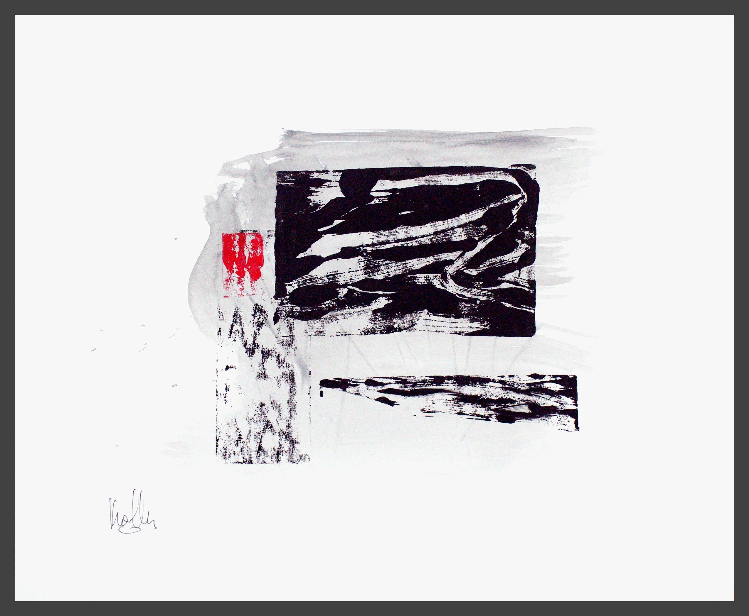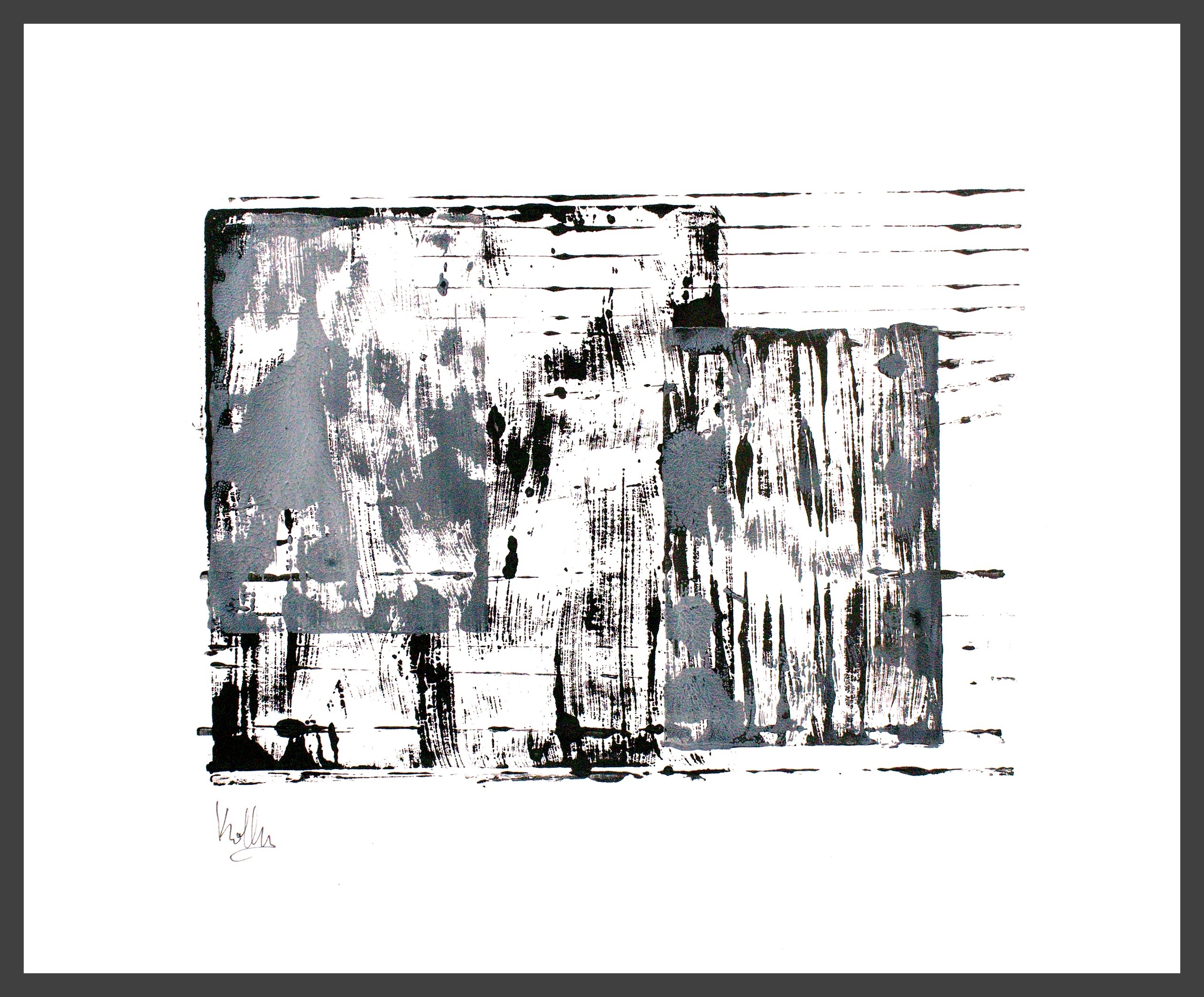 I use different densities of black color derived from hand ground Chinese Ink, carbon, mars and ivory acrylic black and thickened onyx house paint. The resulting matte surfaces and reflections of light mix with the intimacy of the paper to create an endless depth. I mix this with a variety of textures and geometric forms to establish an organic motion. Occasionally I use acrylic reds, blues and golds or gold leaf in the process. The mark making is created using a Brush, Squeegee and Scraper.