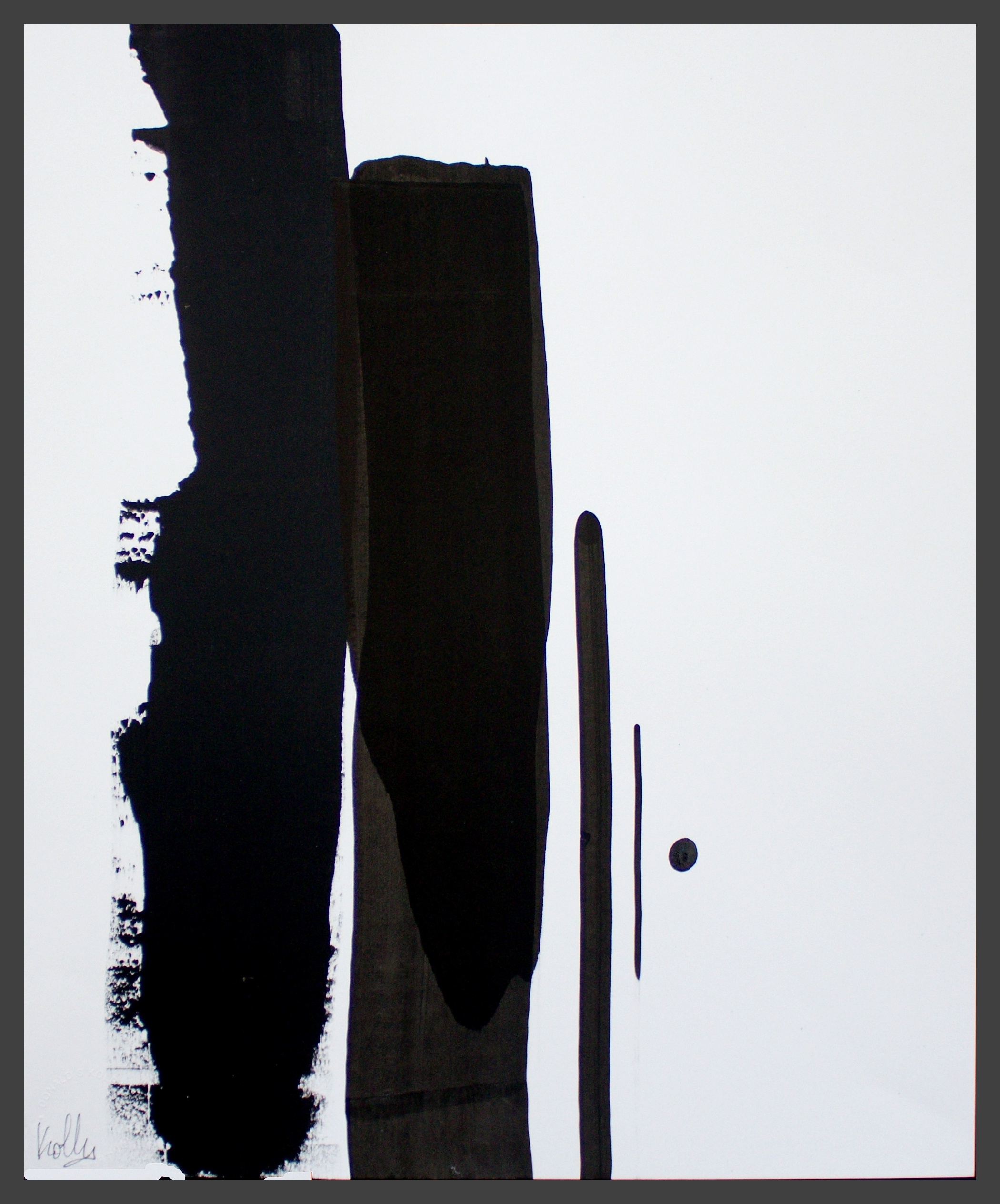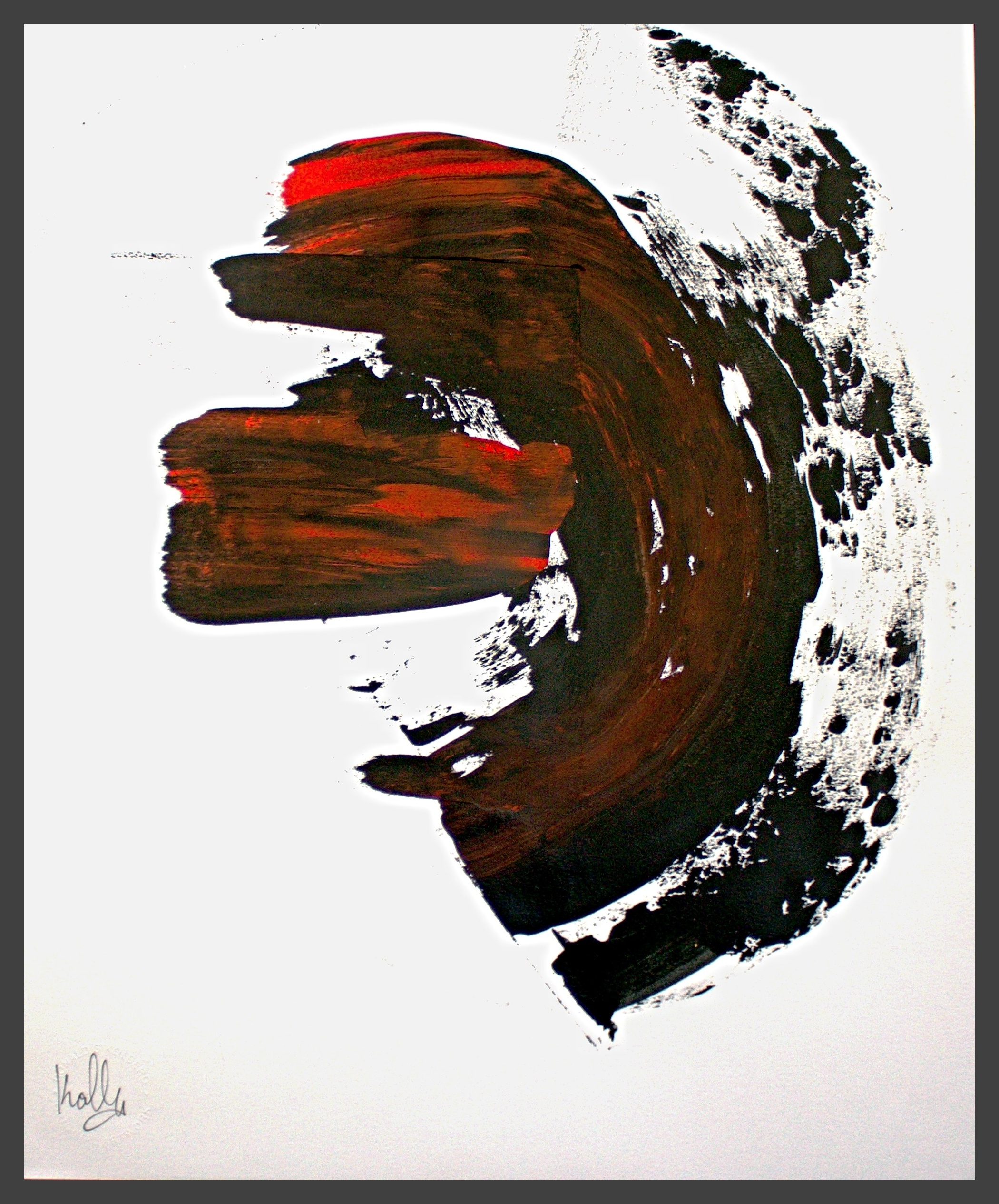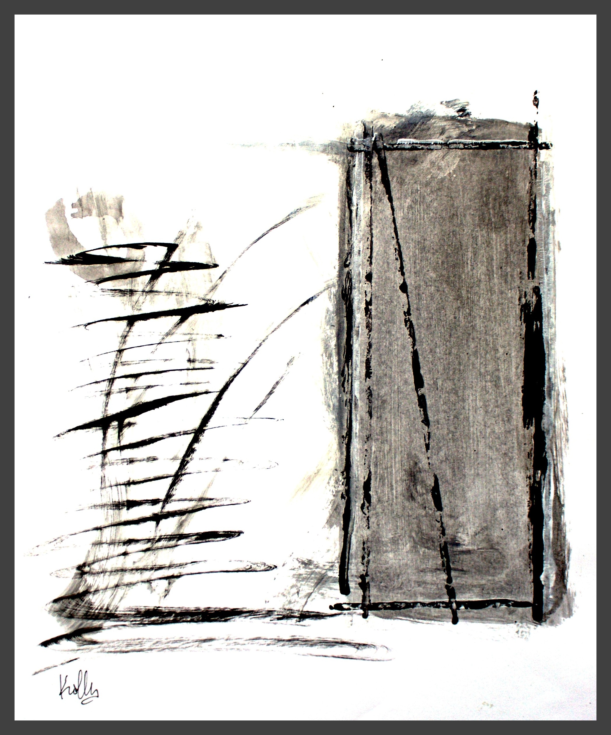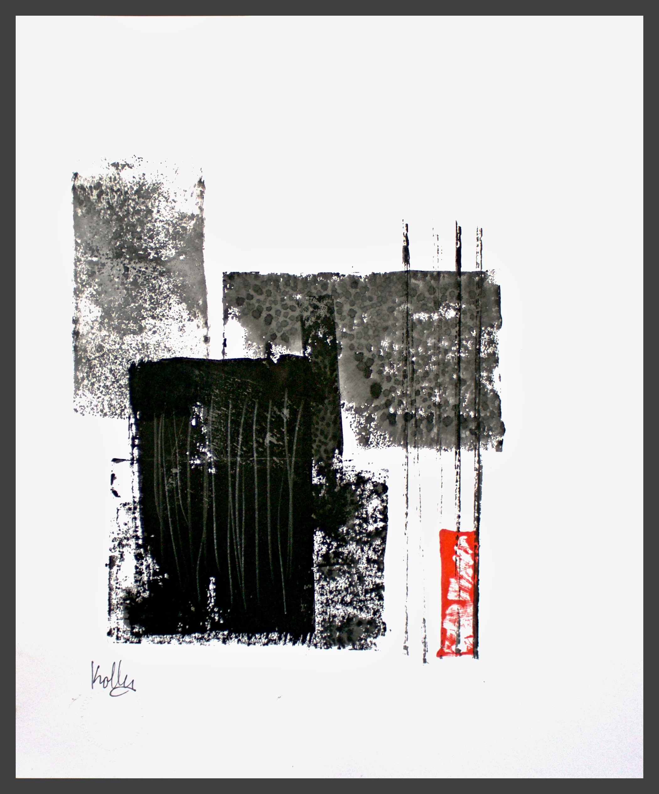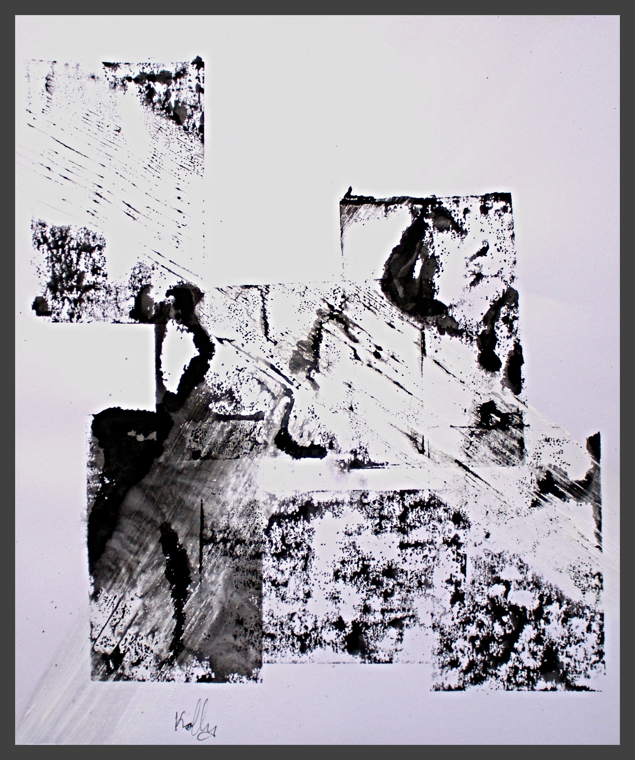 I use different densities of black color derived from hand ground Chinese Ink, carbon, mars and ivory acrylic black and thickened onyx house paint. The resulting matte surfaces and reflections of light mix with the intimacy of the paper to create an endless depth. I mix this with a variety of textures and geometric forms to establish an organic motion. Occasionally I use acrylic reds, blues and golds or gold leaf in the process. The mark making is created using a Brush, Squeegee and Scraper.