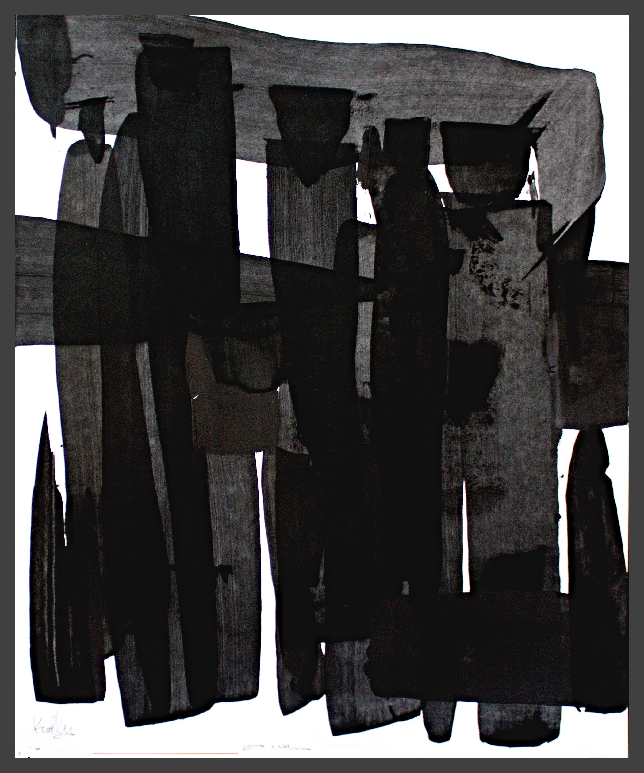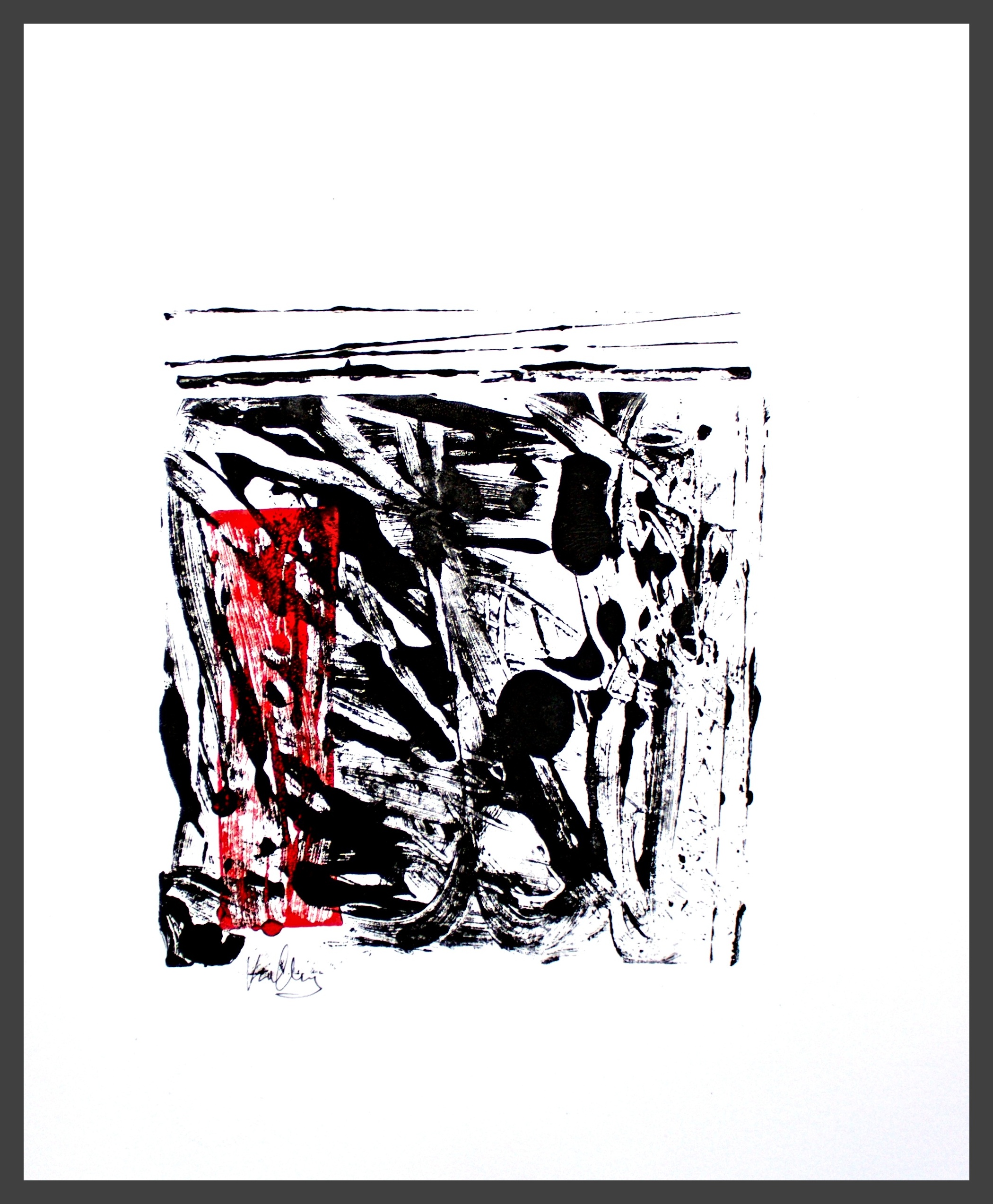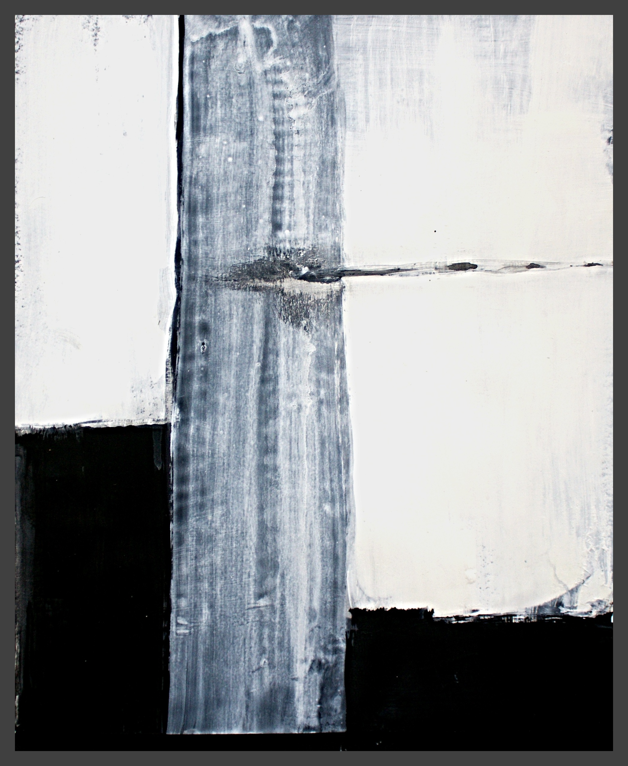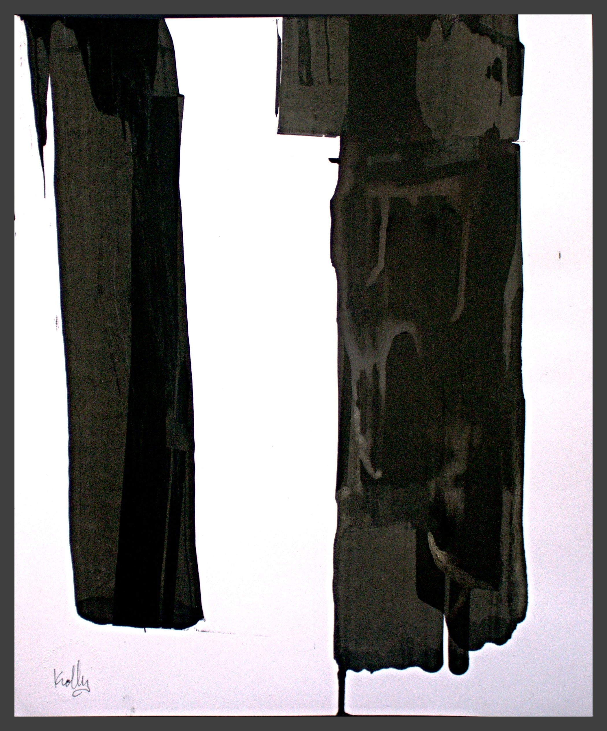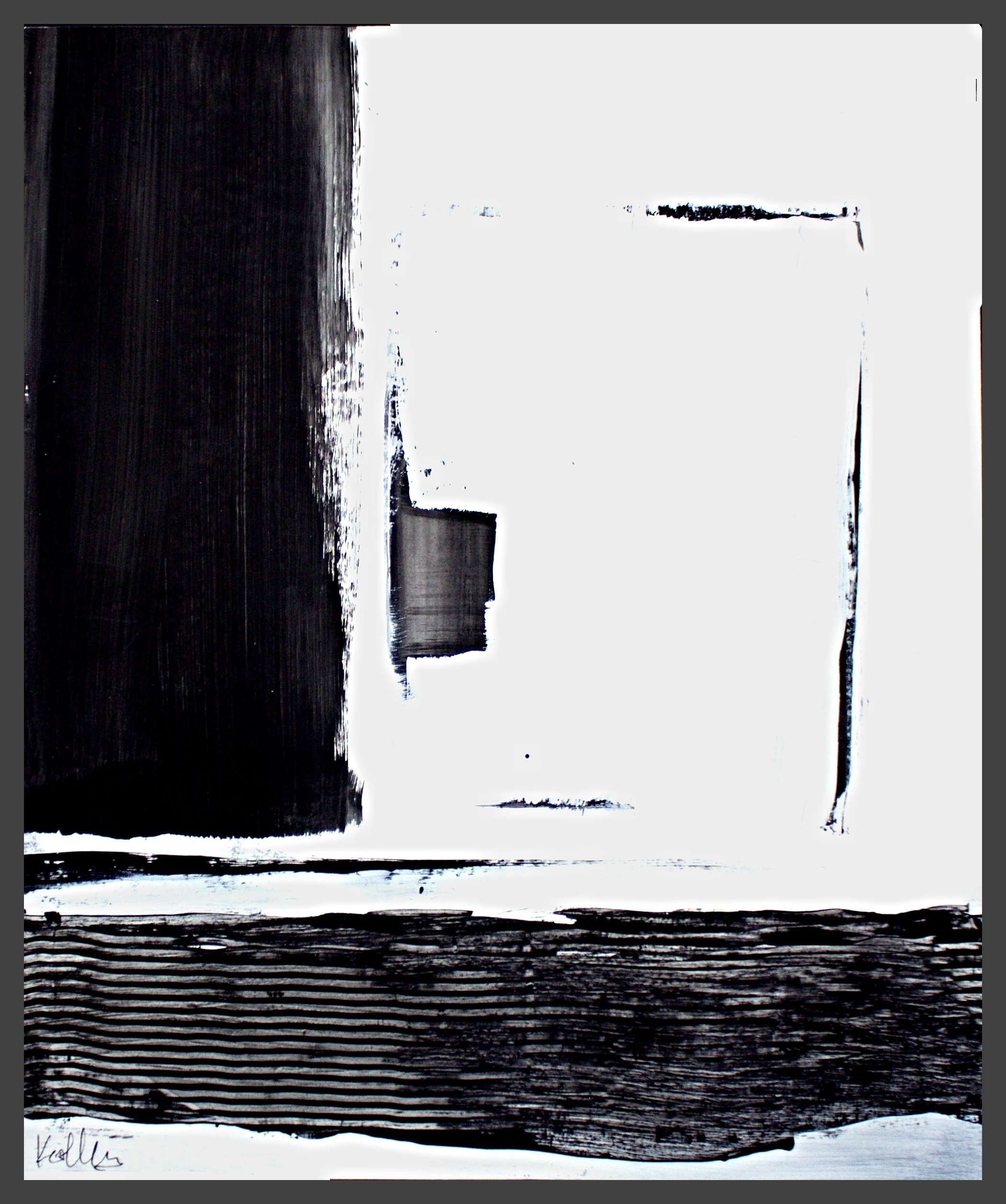 I use different densities of black color derived from hand ground Chinese Ink, carbon, mars and ivory acrylic black and thickened onyx house paint. The resulting matte surfaces and reflections of light mix with the intimacy of the paper to create an endless depth. I mix this with a variety of textures and geometric forms to establish an organic motion. Occasionally I use acrylic reds, blues and golds or gold leaf in the process. The mark making is created using a Brush, Squeegee and Scraper.