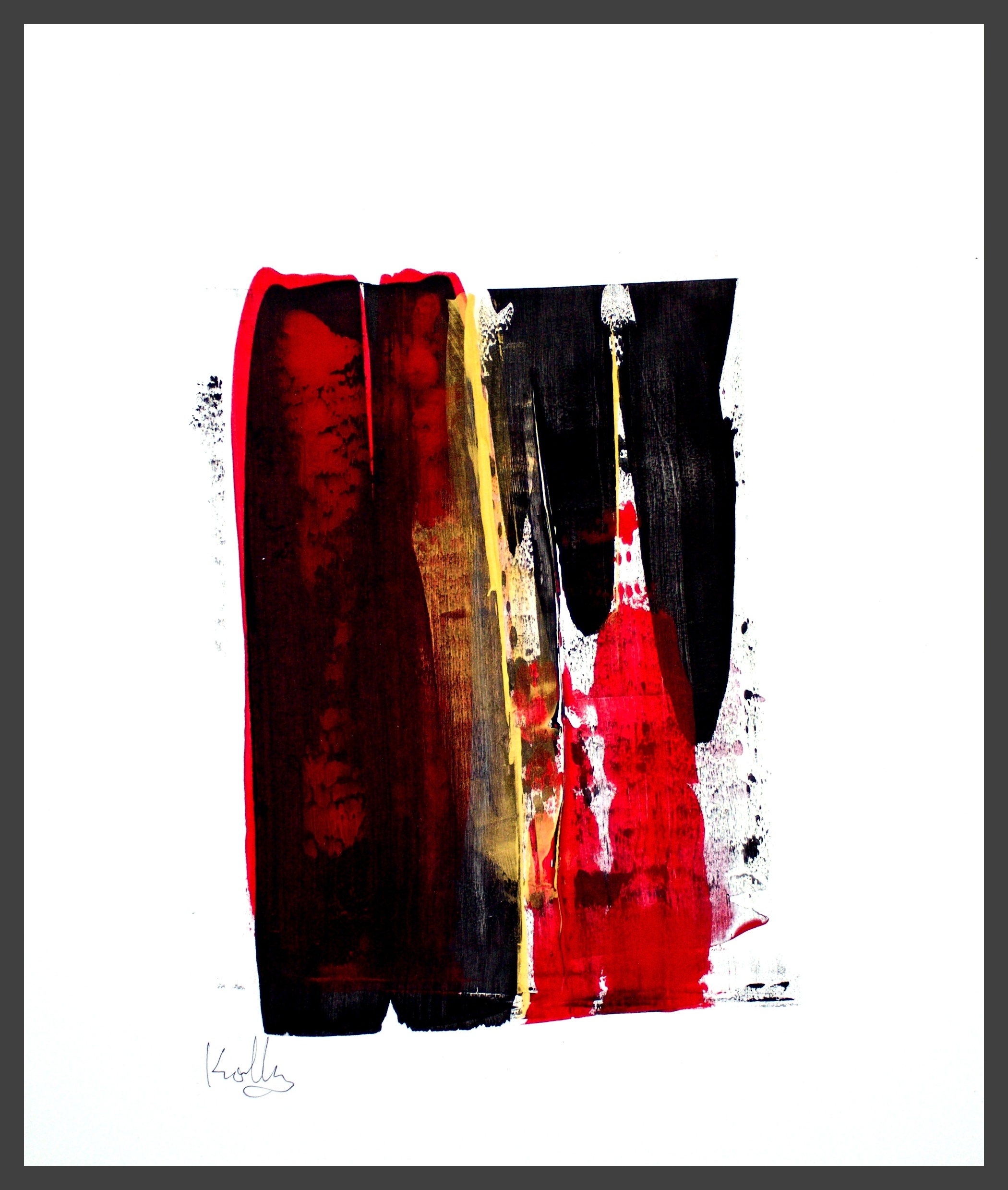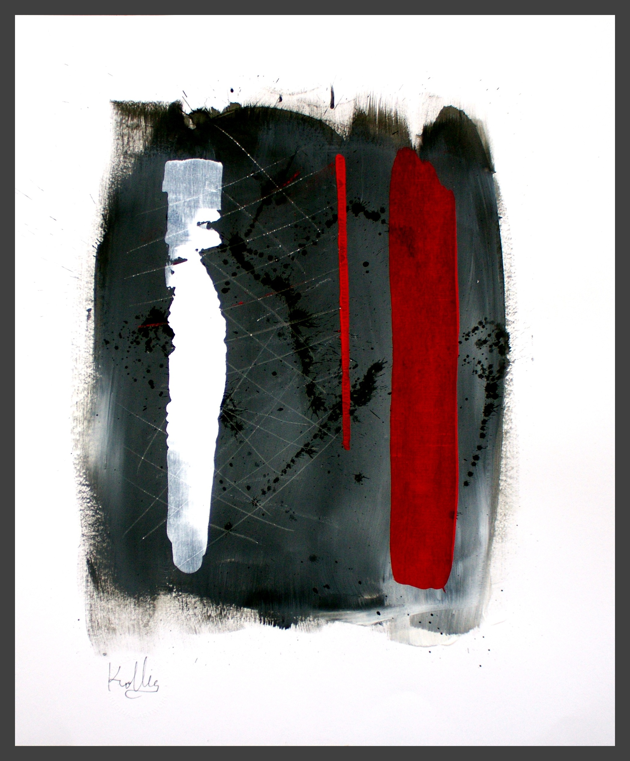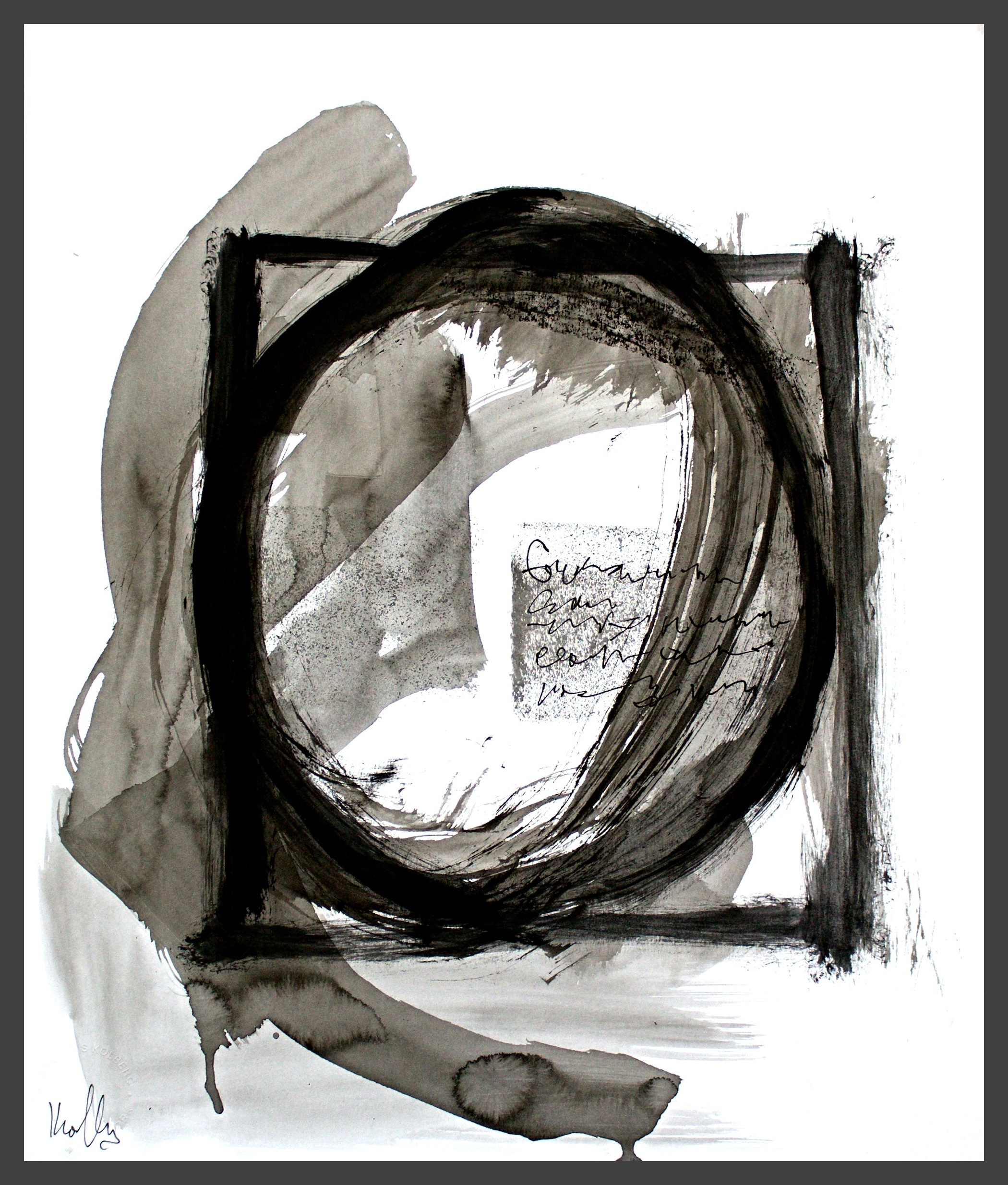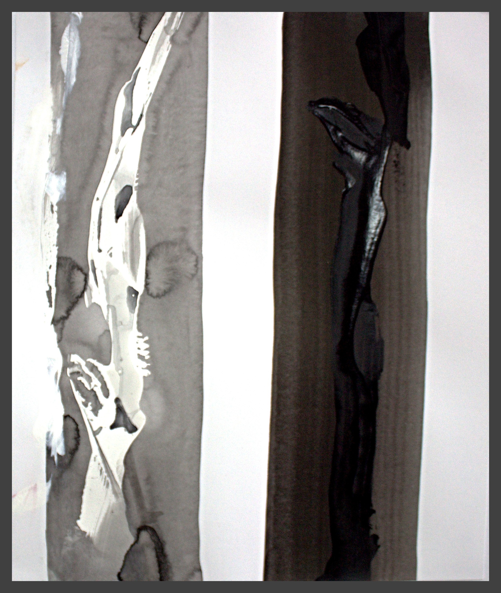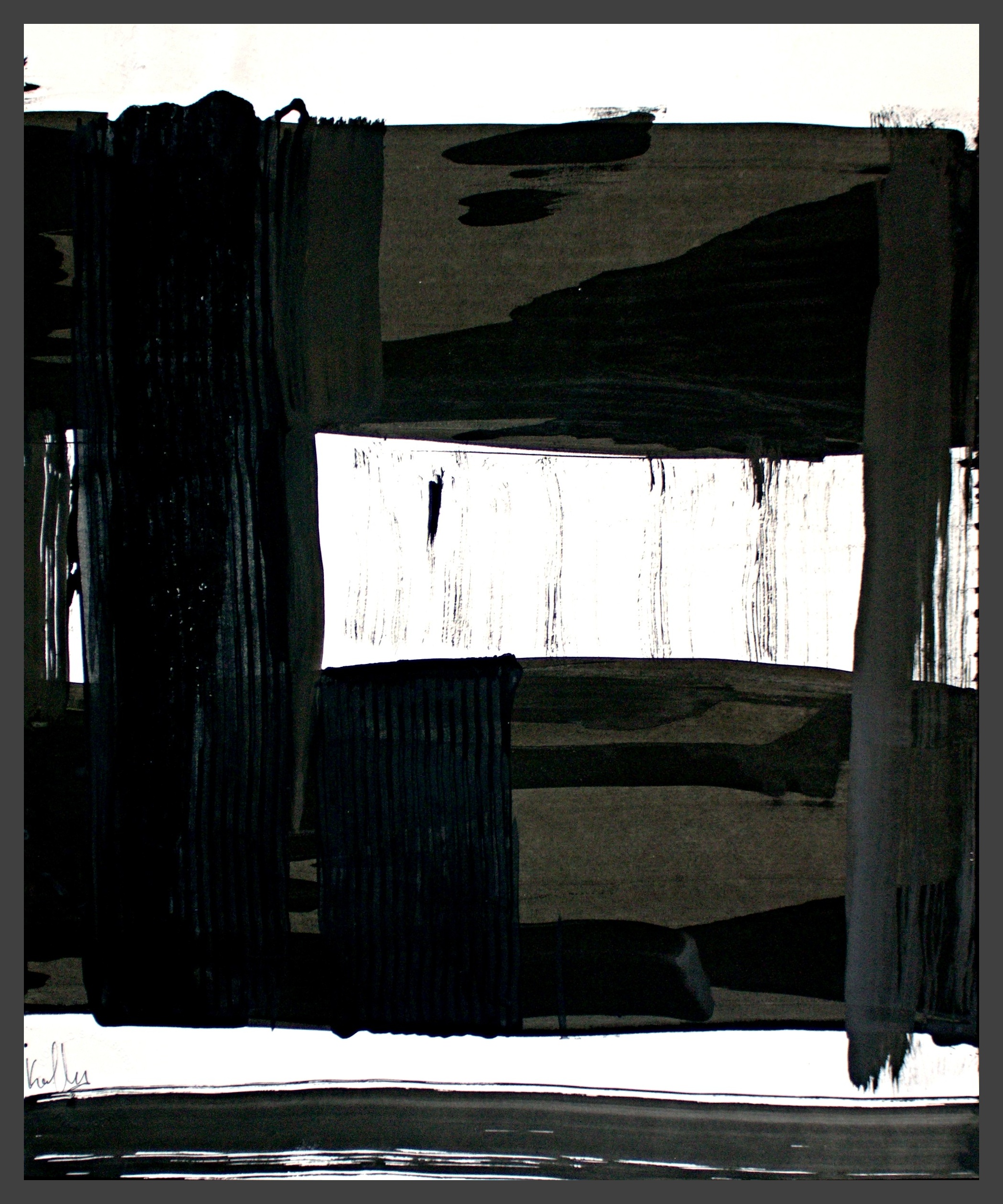 I use different densities of black color derived from hand ground Chinese Ink, carbon, mars and ivory acrylic black and thickened onyx house paint. The resulting matte surfaces and reflections of light mix with the intimacy of the paper to create an endless depth. I mix this with a variety of textures and geometric forms to establish an organic motion. Occasionally I use acrylic reds, blues and golds or gold leaf in the process. The mark making is created using a Brush, Squeegee and Scraper.