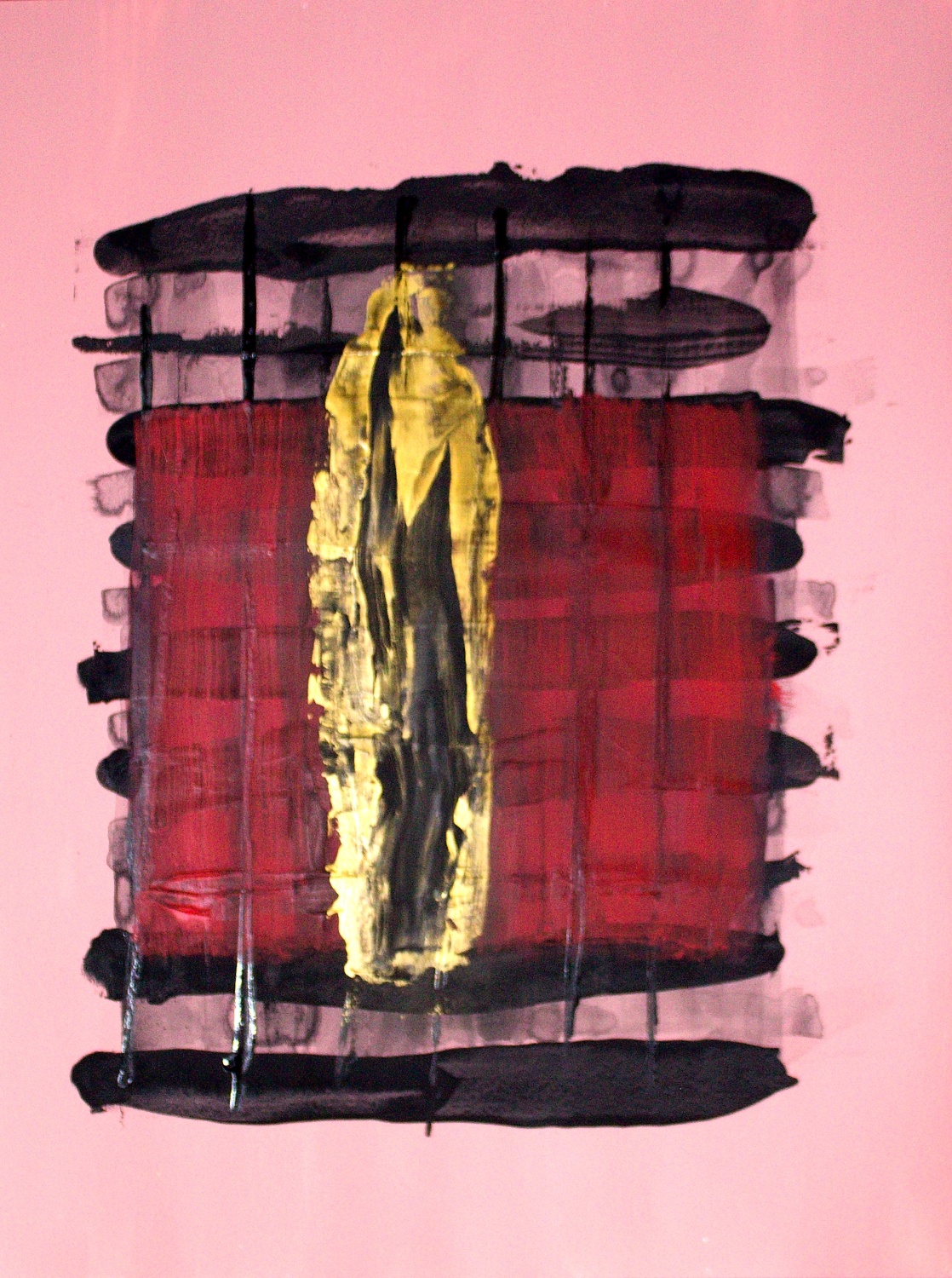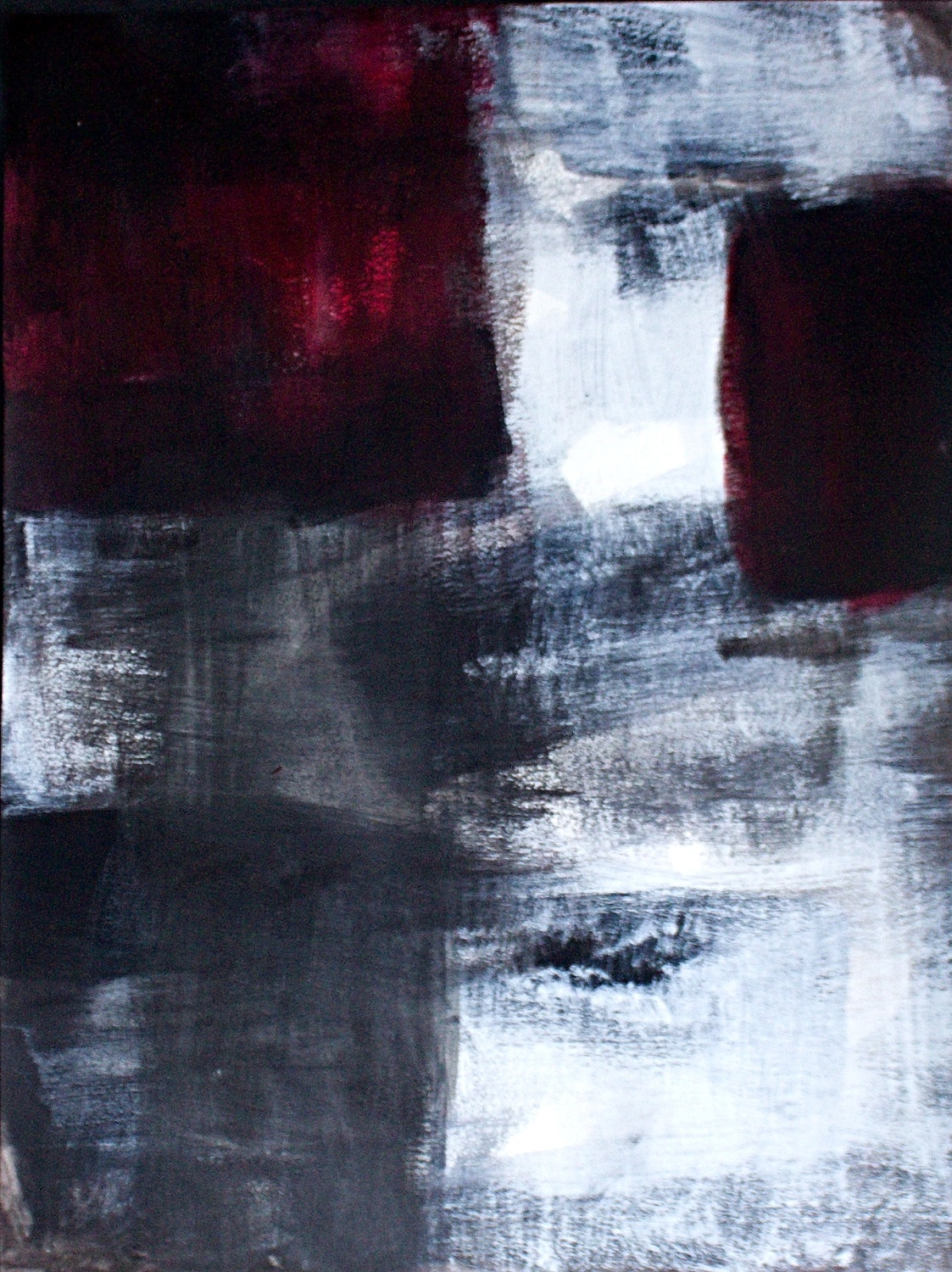 I use different densities of black color derived from hand ground Chinese Ink, carbon, mars and ivory acrylic black and thickened onyx house paint. The resulting matte surfaces and reflections of light mix with the intimacy of the paper to create an endless depth. I mix this with a variety of textures and geometric forms to establish an organic motion. Occasionally I use acrylic reds, blues and golds or gold leaf in the process. The mark making is created using a Brush, Squeegee and Scraper.