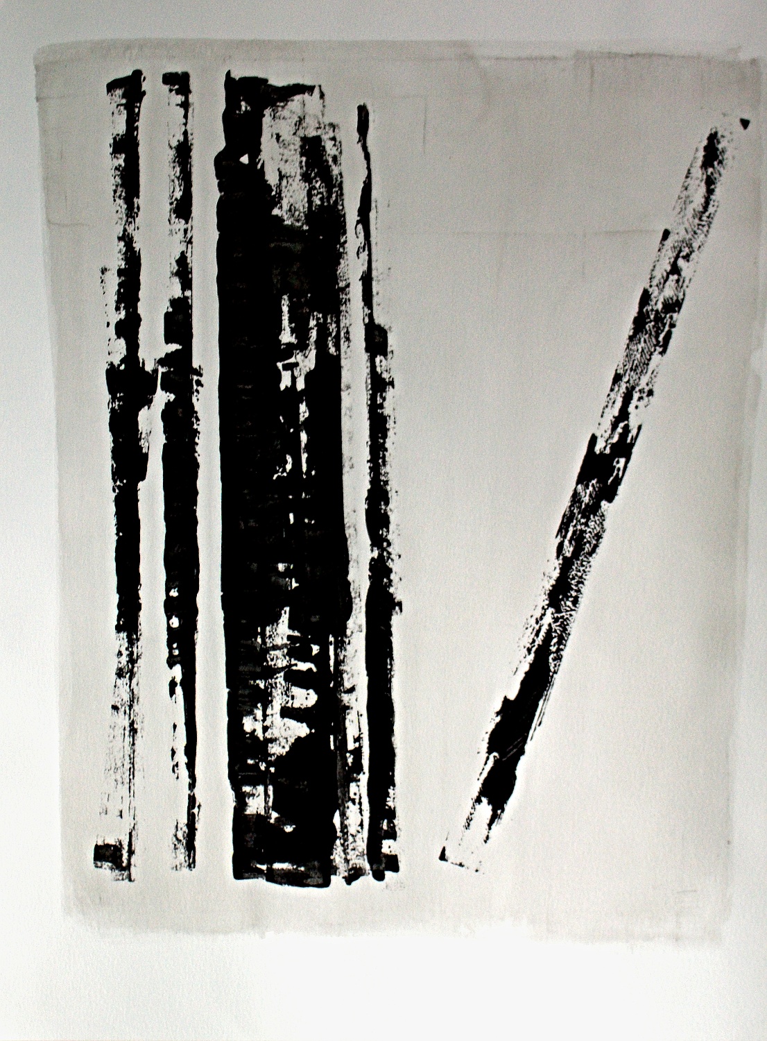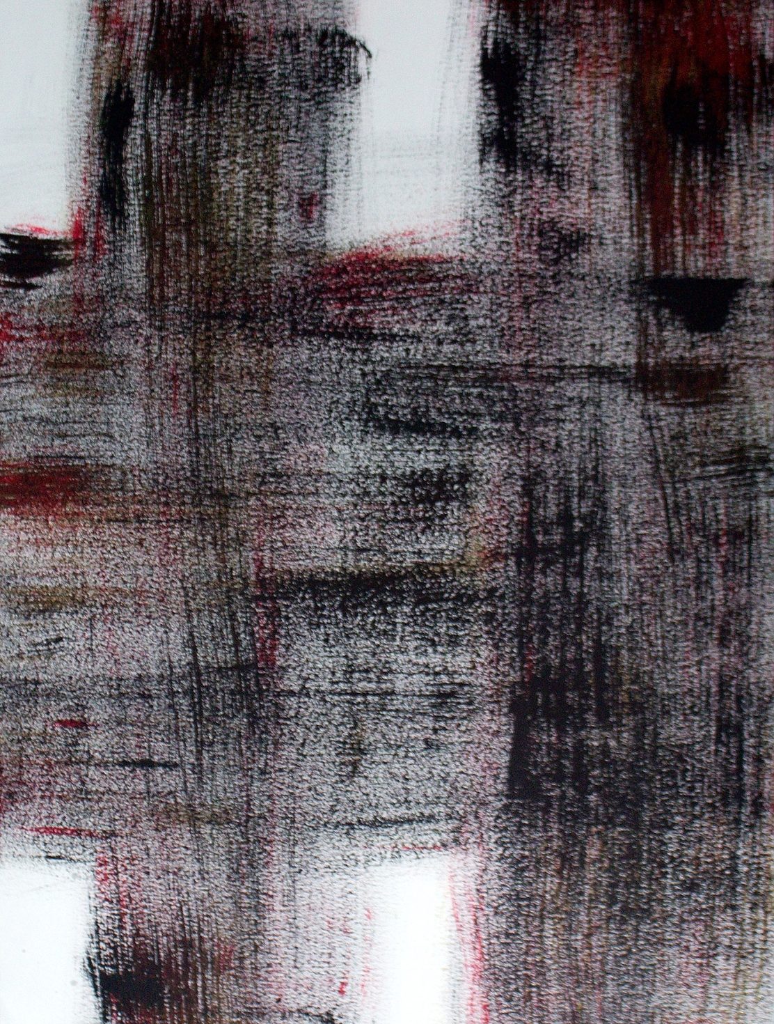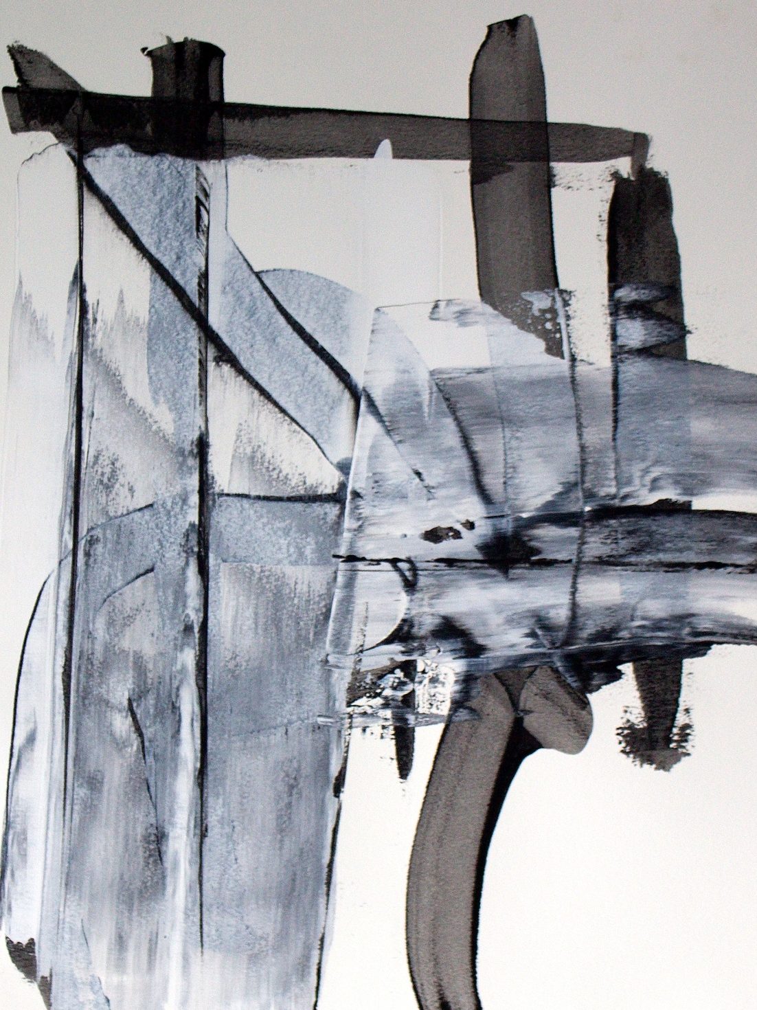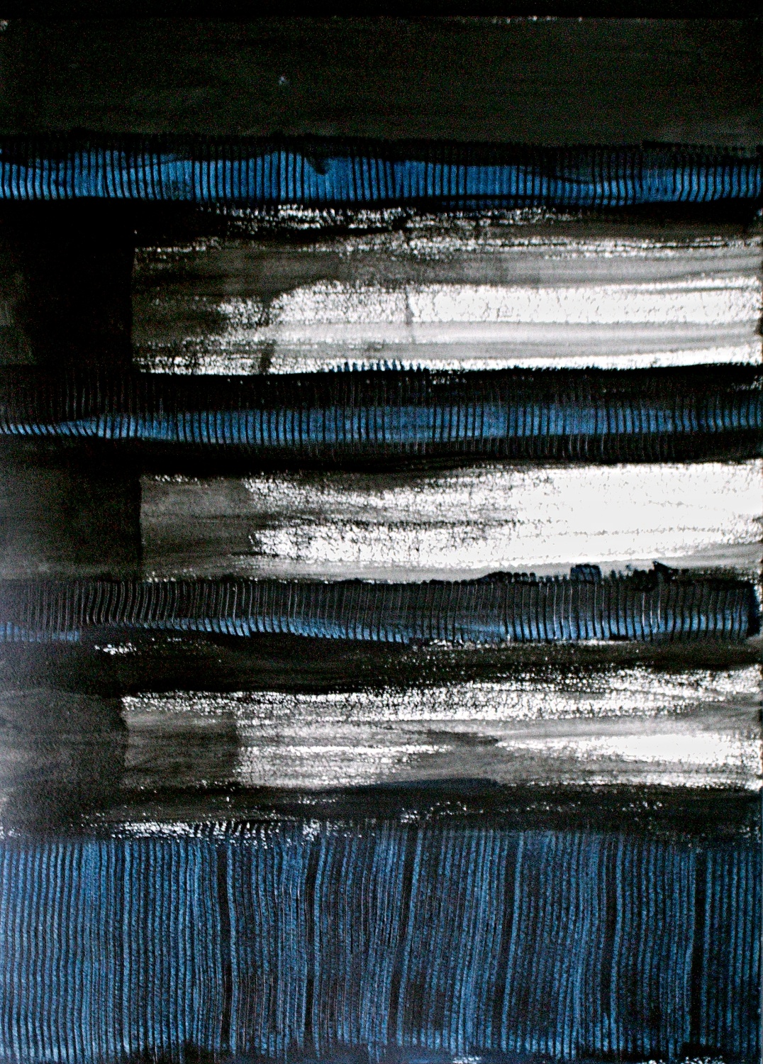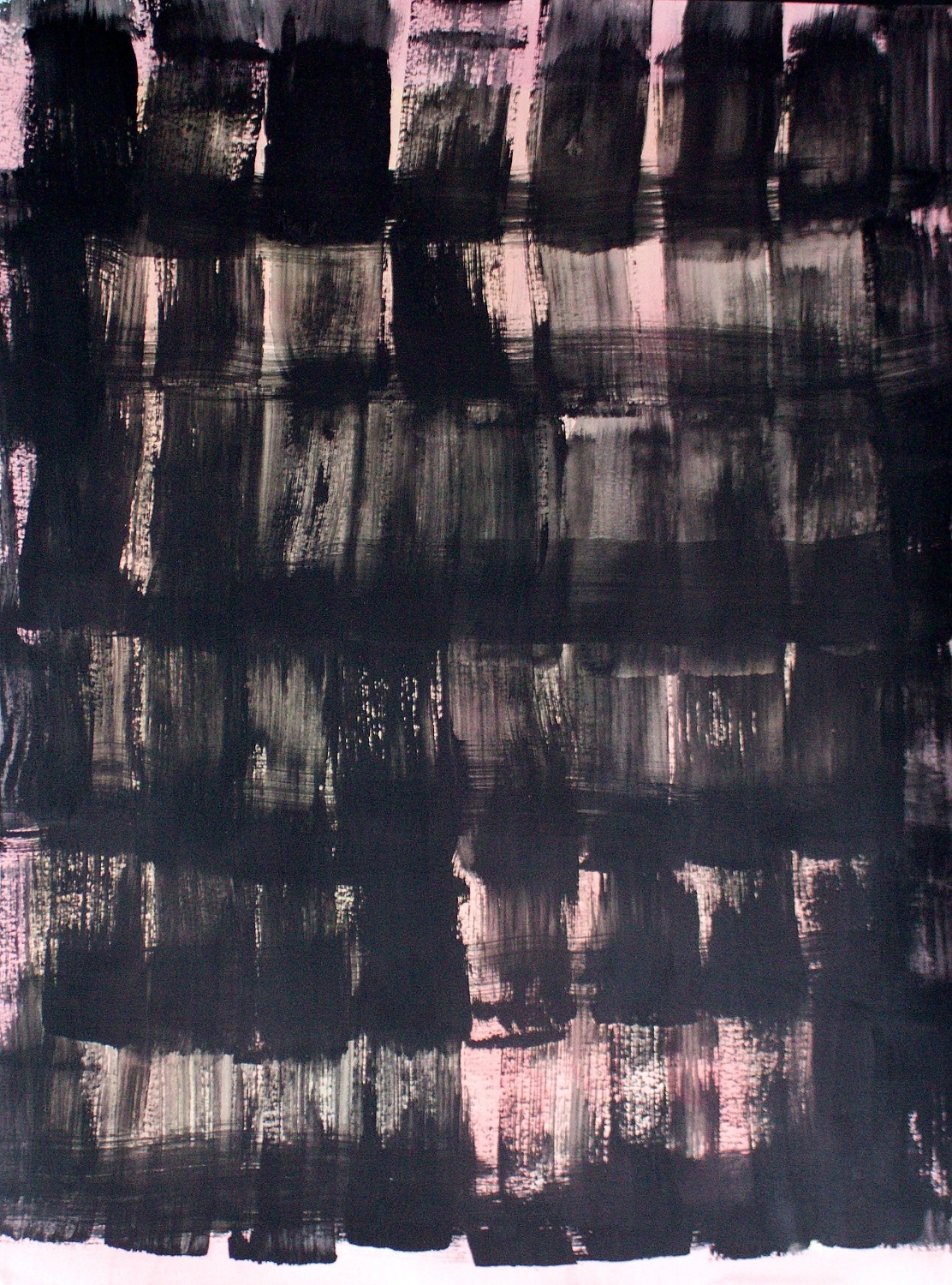 I use different densities of black color derived from hand ground Chinese Ink, carbon, mars and ivory acrylic black and thickened onyx house paint. The resulting matte surfaces and reflections of light mix with the intimacy of the paper to create an endless depth. I mix this with a variety of textures and geometric forms to establish an organic motion. Occasionally I use acrylic reds, blues and golds or gold leaf in the process. The mark making is created using a Brush, Squeegee and Scraper.