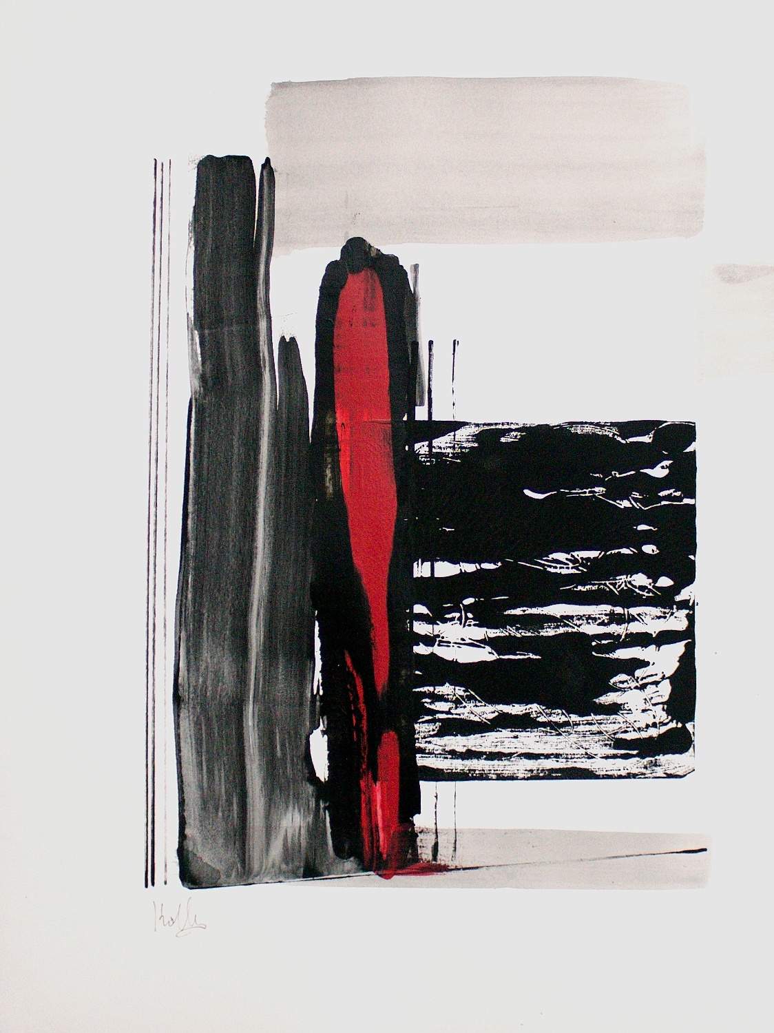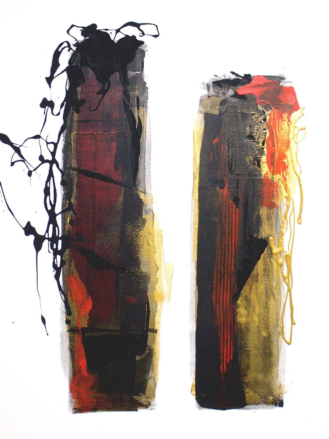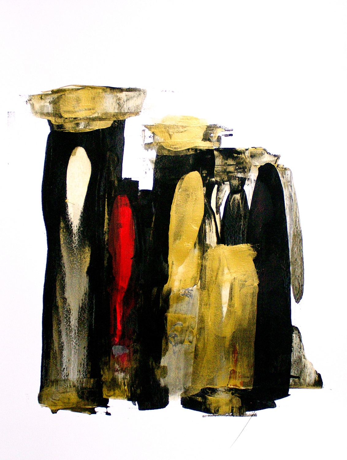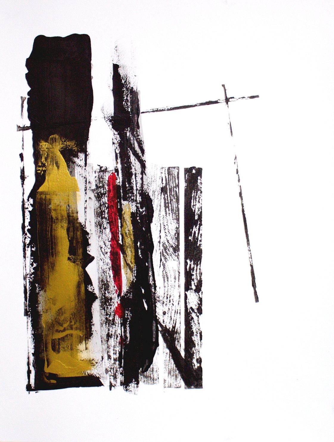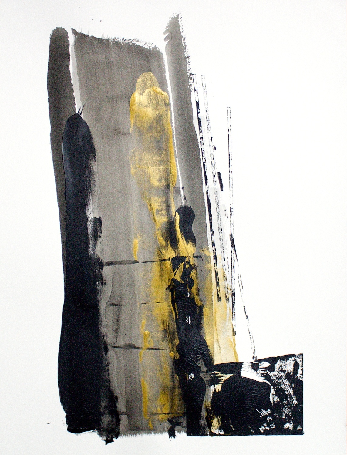 I use different densities of black color derived from hand ground Chinese Ink, carbon, mars and ivory acrylic black and thickened onyx house paint. The resulting matte surfaces and reflections of light mix with the intimacy of the paper to create an endless depth. I mix this with a variety of textures and geometric forms to establish an organic motion. Occasionally I use acrylic reds, blues and golds or gold leaf in the process. The mark making is created using a Brush, Squeegee and Scraper.