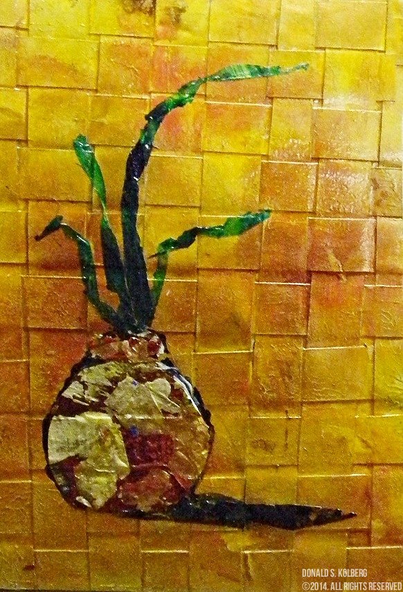 This is a dry acrylic transfer from a reverse painting on glass. It contains collage elements of print material, fiberglass mesh and dry acrylic paint skins.